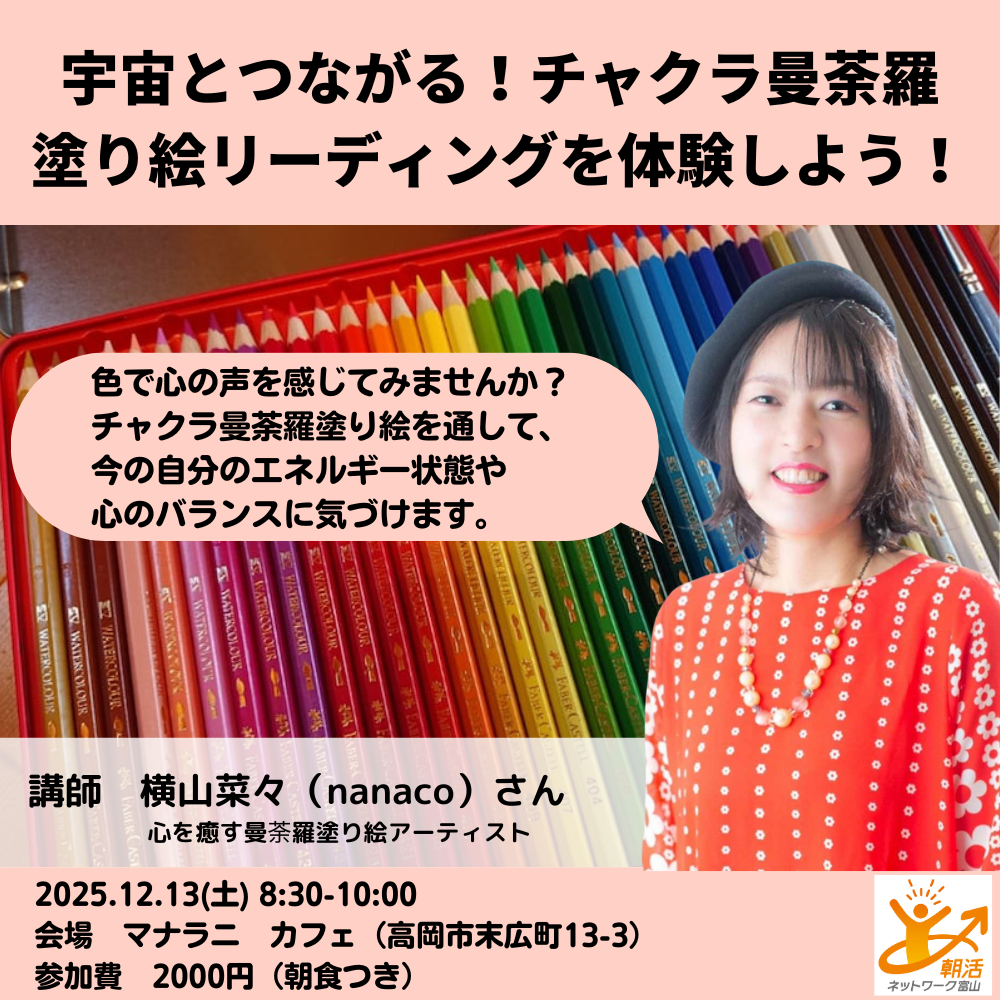2012年からアーティストとして県内外で活動し、2020年6月に「nanacoの部屋」を開業。2025年4月からログハウスの自宅アトリエ(高岡市)にてきのこマンダラ塗り絵セラピー&アーティスト養成講座開講しています。好きなことと個性で生きていけることを伝えたいので、アーティストとして海外進出する夢を追いかけています♪
