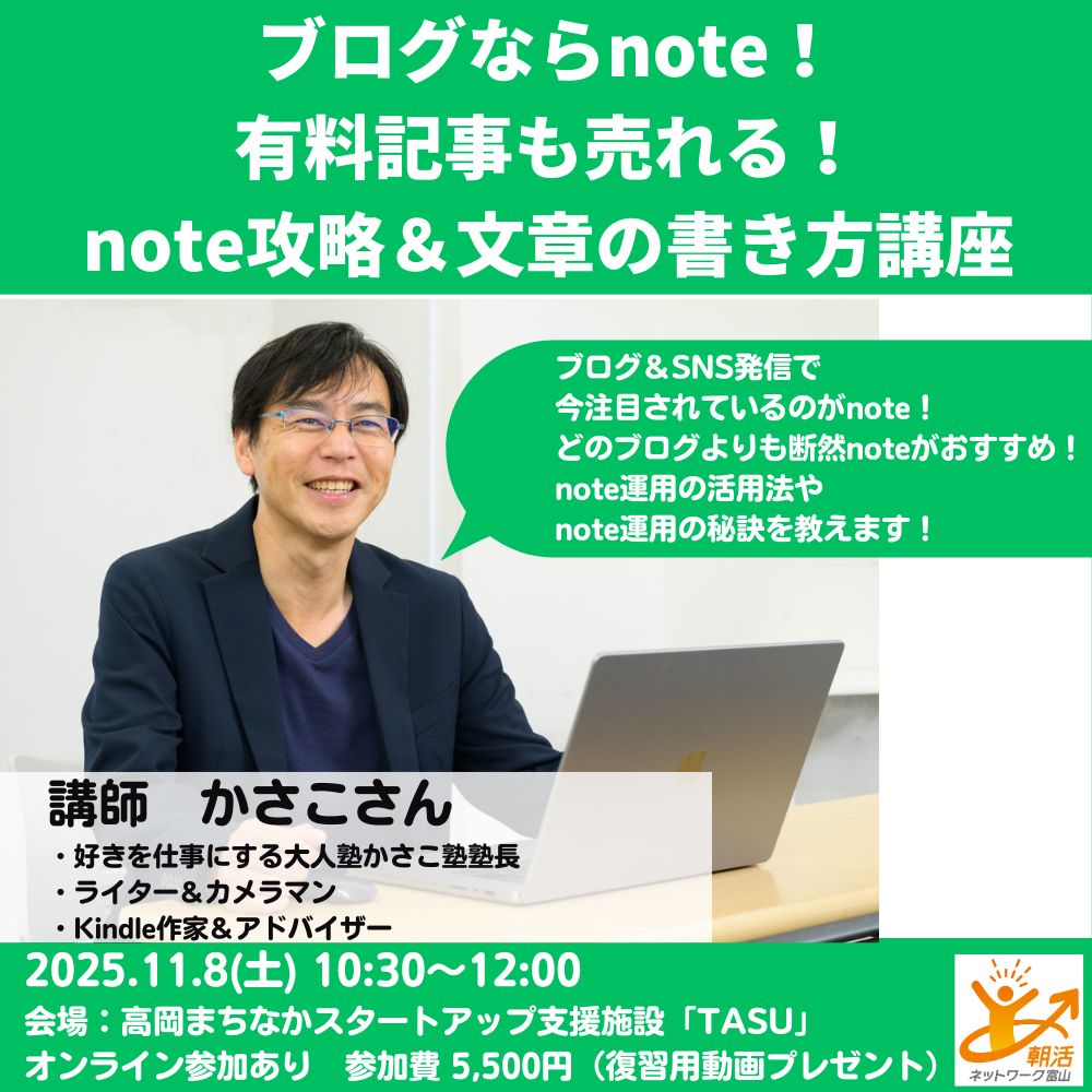 好きを仕事にする大人塾かさこ塾塾長、ライター・カメラマン、Kindle作家&アドバイザー。起業・副業のネット集客などを教える好きを仕事にする大人塾はこれまで2000人以上受講。2000年から25年間、毎日ブログ更新。エキサイトブログ→アメブロ→2025年よりnoteに移行。Kindle出版400冊以上、商業出版22冊。YouTube登録者数約4万人、SNS総フォロワー約12万人。1975年生まれ、横浜在住、川越高校、中央大学法学部卒。